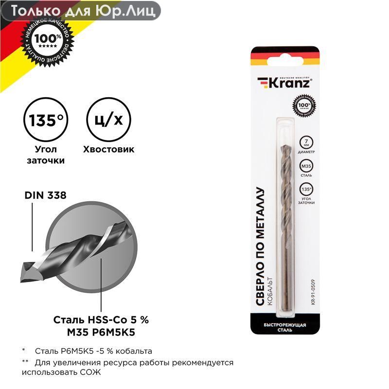 Сверло по металлу 7мм "Кобальт" (сталь HSS-Co 5% M35 P6M5K5) DIN 338 (блист.1шт) Kranz KR-91-0509